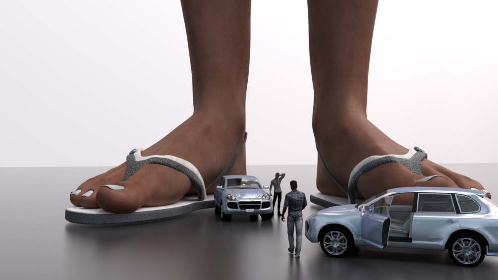 The plot was two college girls are working on a size changing device and have a model city as a test object. One of the college girls goes to get a vehicle to drive around in the model city, since there are two vehicles and they are pretty heavy she asks a couple of male classmates she knows to help her move the vehicles. Once they get back to the lab they are asked if they would want to drive them around the city. Thinking that it's a joke they agree, the vehicles get shrunk and then the two male classmates. The two tiny male classmates are in shock about their new size get approached by the two college girls. The girls instruct the males to test out the vehicles, you see them get into the vehicle and begin driving around seeing it from their point of view. As the girls look down and watch the vehicles drive around their huge feet one of the girls jokes around by saying "What if one of them has a foot fetish?", little do they know one of the guys do. As they watch them drive they see that the vehicles with the guys in them gets even tinier, but then shortly go back to their previous tiny size. After their size stabilizes the one girl decides to shrink herself to the same size as the guys, after she does she instructs her colleague to set a delay shot at herself after she moves the vehicles to the city. She picks the vehicles up along with the tiny people. After she sets them down into the center of the city the size changing device shrinks her down. After she shrinks their professor walks in, she has been wanting to claim this scientific discovery for herself. They decide to partner up with each other and split up to explore the city. Unfortunately they encounter a giant sized professor, well giant sized to them. She uses the size device and decides to make the whole city smaller. The first car seeing everything get bigger decides to get back with the other car. Now it flips over to the other car where they are parked and the girl has a suspicion that this guy has a thing for her and shows that the machine has a beta function that can allow her to communicate with the machine. Unfortunately this function is hit or miss, she is quite surprised that it even works. Watching him shrink she teases him by saying "my friend joked around that one of guys might have a foot fetish". As she continues to tease him saying "Oh my god it looks like you do! You are clinging to it!" the man replies "I'm trying to hang on! I don't know how small I am going to get!" As this is going on they hear the radio in their vehicle go off saying that the professor has shrunk them and city even smaller and that they are meeting up. The one girl tries restoring all of them to normal size but is unable to for some reason... But she is able to partially restore the guy she just shrunk. Both groups finally meet up and come up with a plan find the manual restore points on the opposite points on the city. This will revert them back to their normal size. Easy right? Just as they come up with the plan three other women show up to shoot a fetish photo set, not surprised by the small city they take their tops off and begin the shoot. Will they ever make it to the restore points or will they get crushed by the giant half naked fetish models??